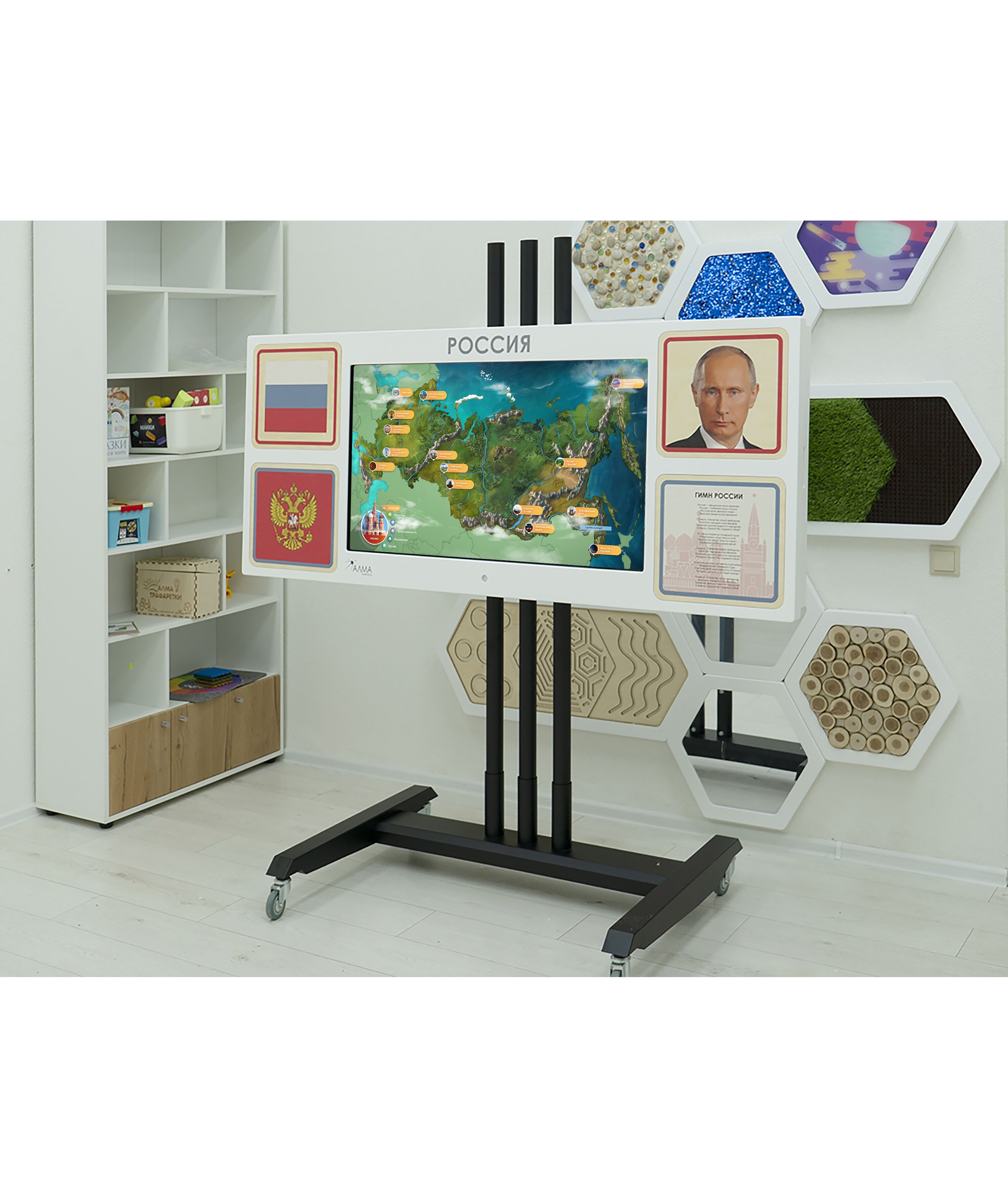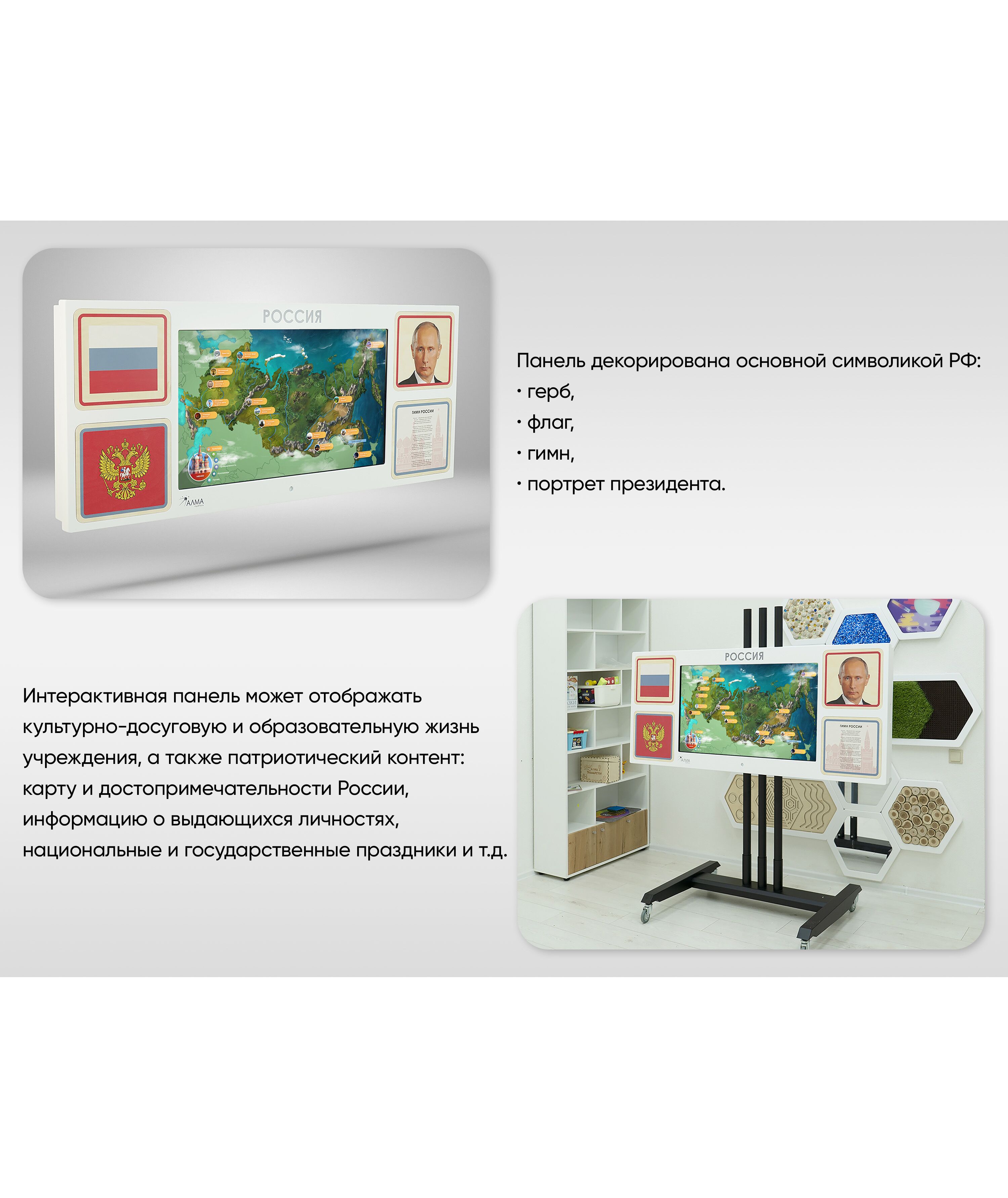 Настенная интерактивная панель с сенсорным монитором, декорированная основной символикой РФ: герб, флаг, гимн, портрет президента. Разработана для реализации программы патриотического воспитания в школе, детском саду или других образовательных учреждениях. Подходит для оформления входной зоны и классов.