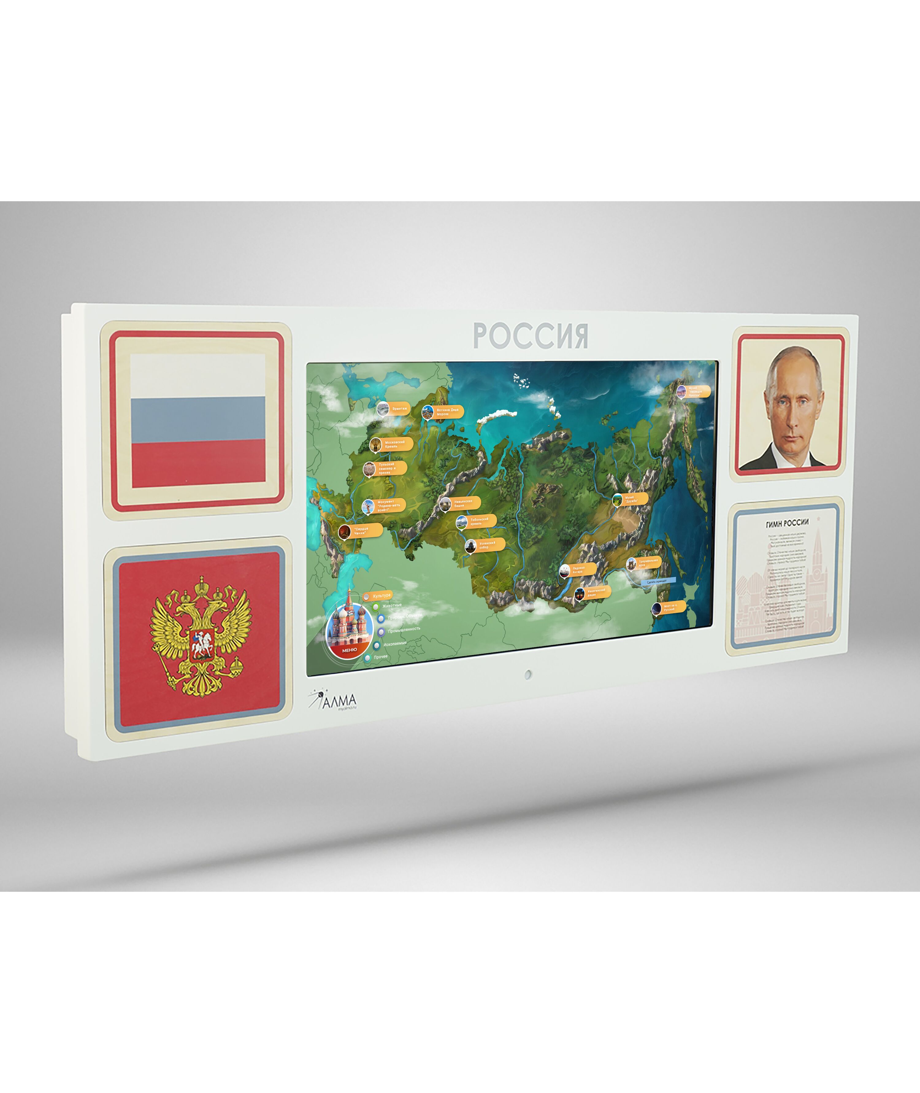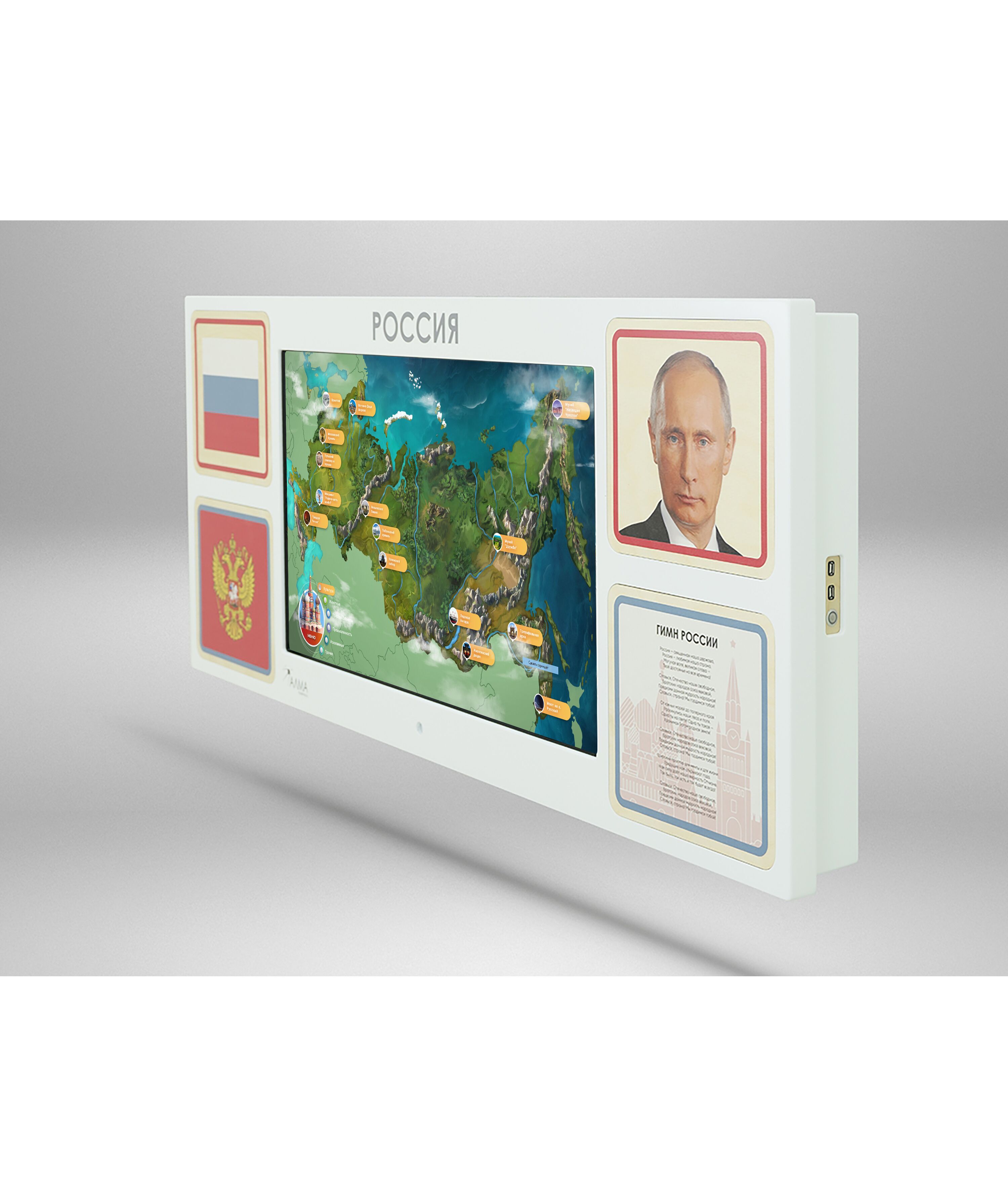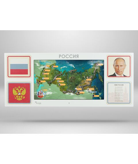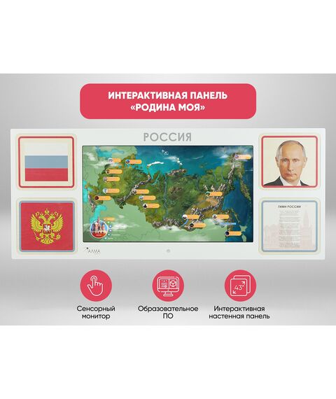 - Интерактивная настенная панель, оформленная основной символикой РФ (43 дюйма, Full HD, мультитач 10 касаний, характеристики встроенного компьютера уточняйте у менеджера)