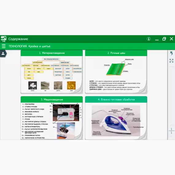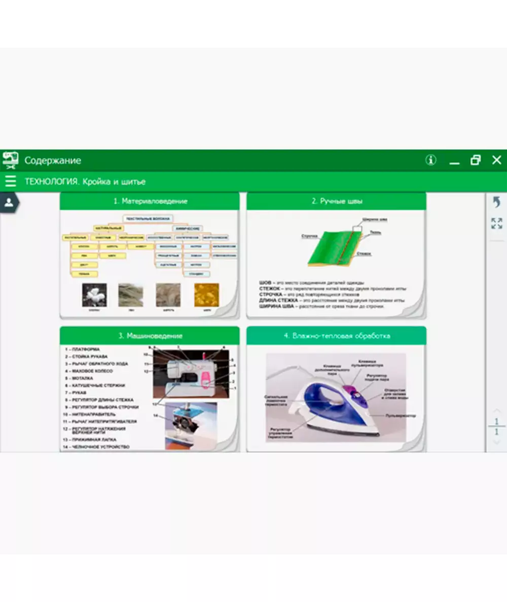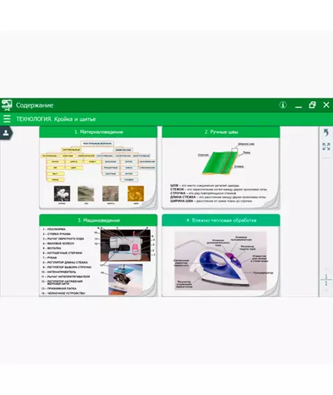 Отличительной особенностью интерактивных учебных пособий Технология. Кройка и шитье» является создание собственной тематической последовательности курса с возможностью включить дополнительные медиа объекты в структуру самого пособия.