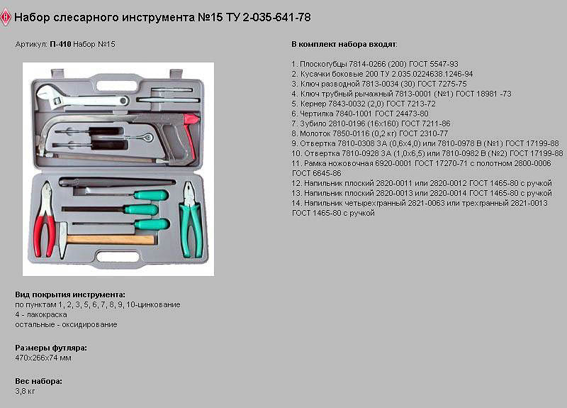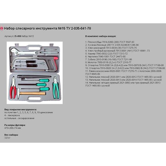 Комплектность: ножовка – 1 шт., напильник плоский – 1 шт., напильник трехгранный – 1 шт., напильник круглый – 1 шт., молоток 0,2 кг – 1 шт., кернер 2.0 – 1 шт., зубило 160 мм – 1 шт., чертилка – 1 шт., отвертка 1.0*6.5 – 1 шт., отвертка 0.6*4.0 – 1 шт., плоскогубцы 200 мм – 1 шт., кусачки боковые 200 мм – 1 шт., ключ трубно-рычажный КТР №1 – 1 шт., ключ разводной КР-30 – 1 шт.