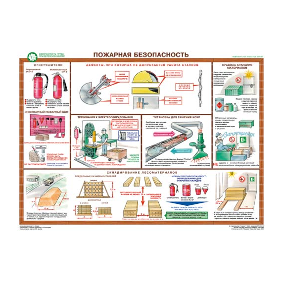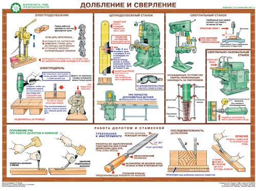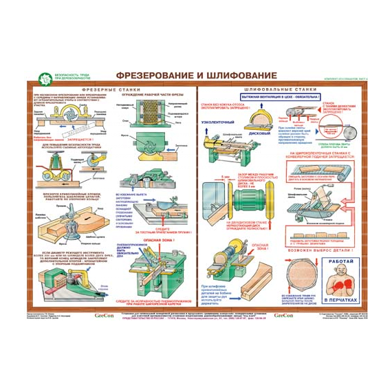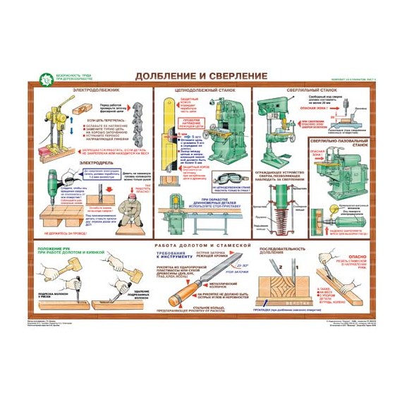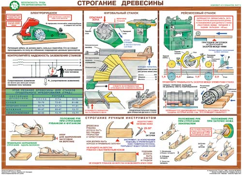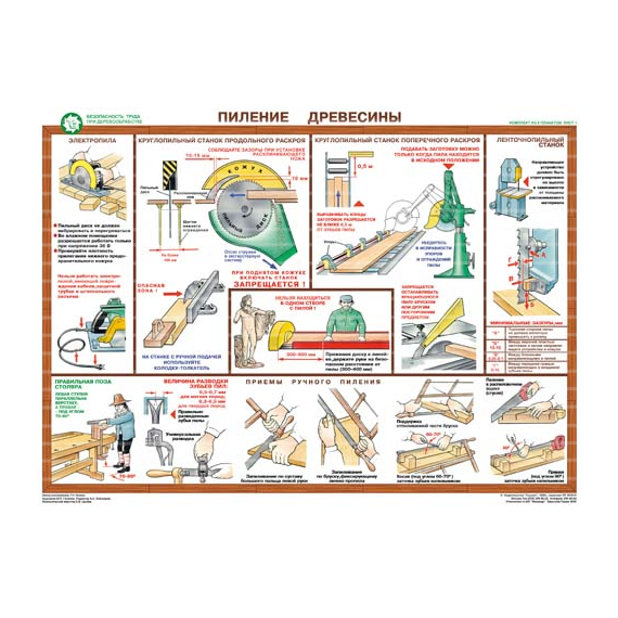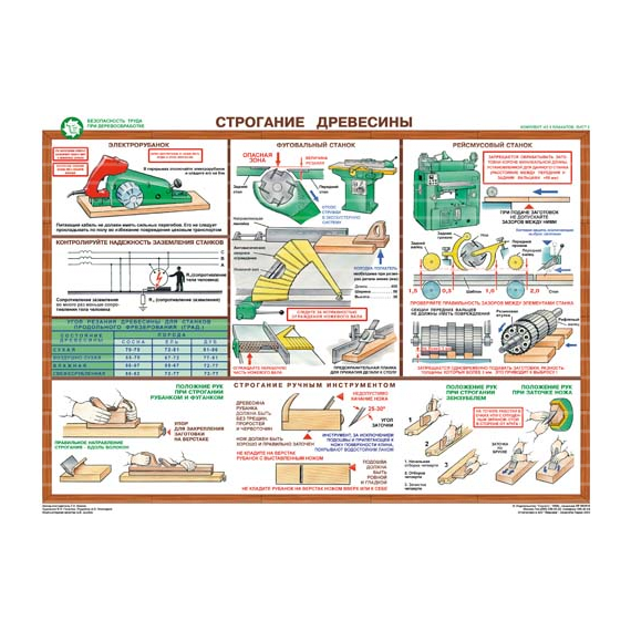 Комплектность: «Пиление древесины на станках, электроинструментом и ручными пилами», «Строгание на фуговальном и рейсмусовом станках, а также электрическим и ручным рубанком», «Правила безопасной работы на долбежных и сверлильных станках, обработки древесины долотом и стамеской», «Фрезерные и шлифовальные станки», «Пожарная безопасность при деревообработке и складирование пиломатериалов».