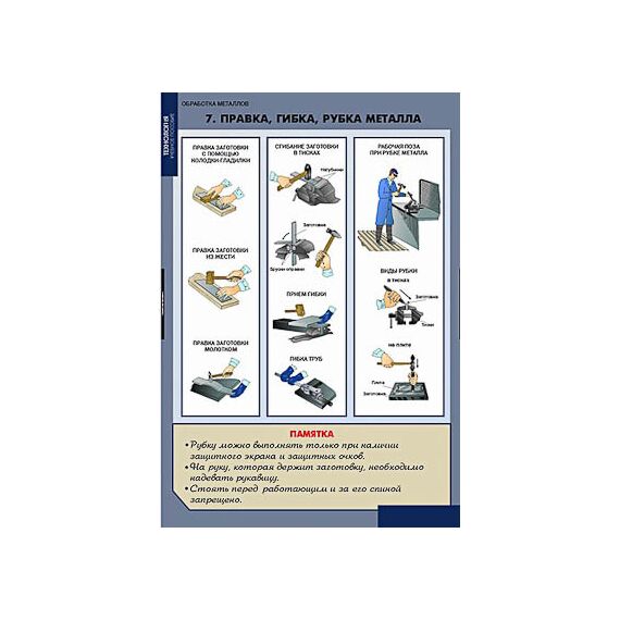 Общие правила поведения в учебных мастерских. Рабочее место учащегося. Инструменты для ручной обработки. Графическое изображение деталей. Технологическая карта. Разметка заготовок. Правка, гибка, рубка металла. Разрезание, опиливание металла. Резьба, её виды. Сверление, точение. Сборка деталей, отделка изделий.