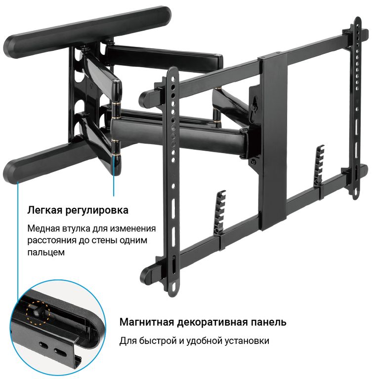 Премиальный поворотно-выносной кронштейн Exell EXi-X9086 для телевизоров с диагональю 49–90 дюймов использует инновационные материалы и продвинутые технические решения. Благодаря этому он не только выдерживает вес до 90 кг, что гарантирует безопасность, но и обеспечивает полный диапазон движений, включая выдвижение 69–690 мм, наклон -10°/+5°, поворот ±60°, коррекцию уровня ±2°. Выдвигать или складывать кронштейн еще никогда не было так просто – улучшенная конструкция со встроенными медными втулками двигается максимально плавно. Два многофункциональных кабельных зажима элегантно скрывают, защищают и поддерживают кабели. EXi-X9086 – уникальный дизайн и высокое качество для самых искушенных.