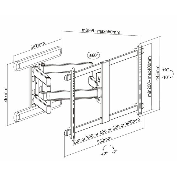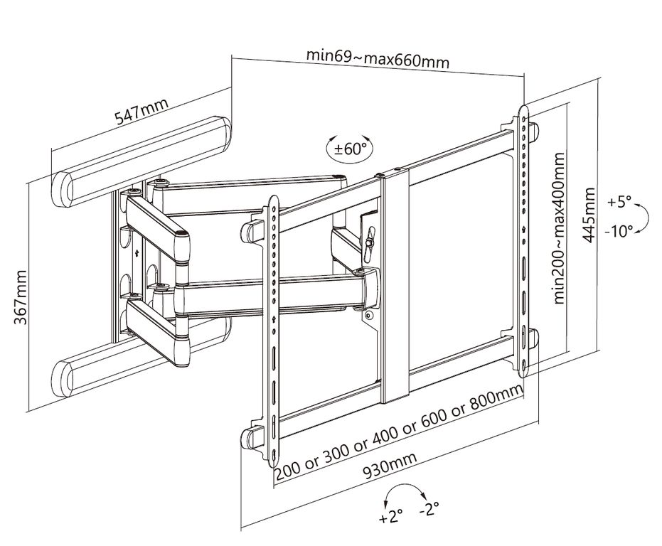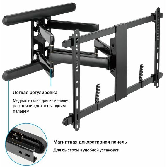 Настенный выдвижной кронштейн для ТВ Exell EXi-X9086 37"-80", 2х2 колена, VESA 800x400мм, до 90 кг, 69-660 мм от стены, наклон -10/+5, поворот +60/-60, коррекция уровня +2/-2, черный